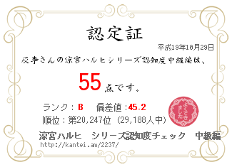灰李さんの涼宮ハルヒシリーズ認知度中級編は、 55 点です。